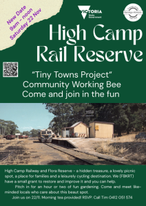 This is a working bee, to clean up an area around the former High Camp railway station platform. Members from Friends of the Bendigo-Kilmore Rail Trail, Wallan Environment Group, Mitchell Bicycle User Group, and Mitchell Environment Group (BEAM) are involved with this project.